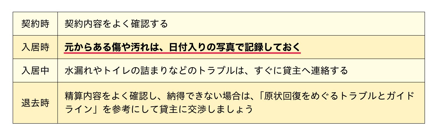 退去時の原状回復費用をめぐるトラブルが多く発生しています。事前に準備しておくことで、不要な負担を避けることができます。以下のポイントを押さえておきましょう。
